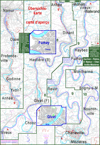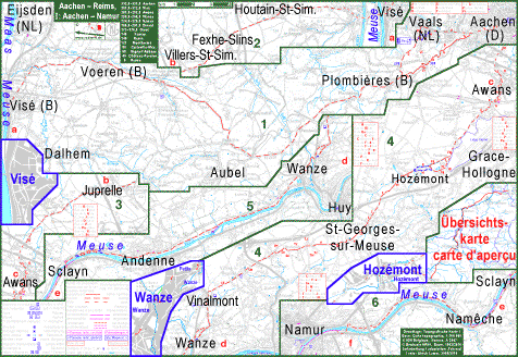 | Feuille I: Aix-la-Chapelle Visé Namur | Feuille II: Namur Charleville-Mézières | Feuille III: Charleville-Mézières Reims | ||||||||||||