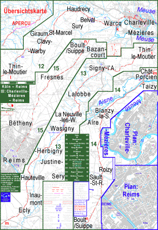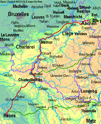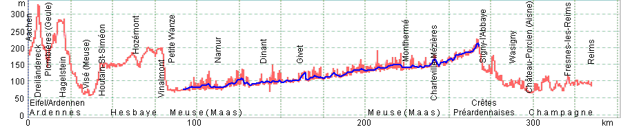 Cette page recommande un itinéraire directe pour aller à vélo entre Reims et Aix-la-Chapelle. Le sens de la présentation (d'Aix-la-Chapellee à Reims) n'implique pas de prioritée d'un sens de l'utilisation. Entre Reims et Charleville-Mézières, l'itinéraire utilise routes tranquiles de la Champagne et des Pré-Ardennes françaises, de l'Ardenne belge et de l'Eifel. Dans la vallée de la Meuse entre Charleville-Mèzières et Givet la piste cyclable tres comfortable au nom de Voie verte transArdenne est utilisé. De Wanze près de Huy jusq'à Visé le passage de l'agglomeration de Liège est évité par aller sur le plateau de l'Hesbaye. De la Meuse à l'Aix-la-Chapelle, le trançon fu choisi sur routes de circulation moderée et un profil des hauteurs pas trop fort. |