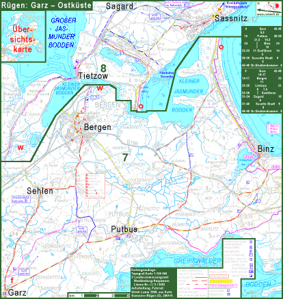 Auf dem Fahrrad von Berlin direkt nach Greifswald und nach Rügen: Vom Stadtzentrum Berlins führt eine Fahrradroute auf dem ehemaligen Mauerstreifen nach Schildow. Von dort geht es auf Landstraßen nach Liebenwalde. Dann kommt der asphaltierte Radwanderweg am Vosskanal nach Zehdenick. In die Altstadt von Zehdenick fährt nman mit dem Fahrrad am besten auf der Berliner Str. und verlässt sie nach Einkehr und evt. Besichtigung durch die selbe Straße. Die anderen Zufahrten haben übles Kopfsteinpflaster. Von Zehdenick führt der Radfernweg Berlin Kopenhagen größtenteils asphaltiert durch den Ziegeleipark an der Oberhavel nach Marienthal. Die Route von Marienthal nach Himmelpfort lässt sich gegenüber dem Radfernweg Berlin-Kopenhagen in einigen Abschnitten abkürzen. Von Lychen folgt die Route Nebenstraßen nach Burg Stargard und Neubrandenburg. Neubrandenburg wurde 1248 gegründet, als typische ostdeutsche Kolonialstadt mit rundem Umriss und schachbrettförmigem Straßennetz. Neubrandenburg hat einen gut erhaltenen mittelalterlichen Mauerring mit 4 Toren. Die Bebauung in der Altstadt vonNeubrandenburg wurde aber am Ende des zweiten Weltkrieges fast vollständig zerstört. Bei erhaltenem mittelalterlichen Straßennetz zeigt Neubrandenburg so die verschiedenen Bauperioden von 40 Jahren DDR. Von Neubrandenburg nach Altentreptow folgt die Route teilweise dem Tollense-Radwanderweg. Der Autoverkehr auf der L 35 (ehemalige F96 bzw. B96) hat seit der Fertgstellung der Ostseeautobahn in einigen Abschnitten etwas, in anderen stark nachgelassen. Zwischen Neubrandenburg und Altentreptow hat die Straße immer noch deutlich mehr KFZ-Belastung als die Straße auf der Westseite des Tollensetals, die daher zu bevorzugen ist. Nördlich von Altentreptow fehlt ein Stück weit eine brauchbare Alternative zu der alten Fernstraße. Von Mülenhagen bis kurz hinter Burow kann man jedoch auf gutem Belag durch Felder und Wiesen radeln. Von Klempenow bis Jarmen und noch ein kurzes Stück über die Peene hinweg fahren die meisten Autos auf der nur etwa 1 km entfernt parallel verlaufenden Autobahn. Die L 35 hat hier einen Radweg bekommen, der aber von der KFZ-Belastung her eigentlich überflüssig ist. Da der Radweg etwa eine halben Meter tiefer als die Fahrbahn angelegt wurde, wird man bei Dunkelheit von entgegen- kommenden Autos so star geblendet, dass der Radweg lebensgefährlich ist und man mit dem Fahrrad wesentlich sicherer auf der Fahrbahn fährt. Ab der Abfahrt Gützkow benutzt der meiste Autoverkehr zwischen Berlin und Greifswald die L 35. Kurzz hinter Breechen kann man westlich auf eine Nebenstrecke ausweichen, dei bis Görmin sehr ruhig ist, dann wenig bis mäßigen Autoverkehr hat. Schon gleich nach der Peenebrücke links abzuzweigen würde eine Fahrt auf ziemlich unangenehmen Belägen bedeuten. Von Dersekow über Levenhagen nach Kirchdorf führt die kürzeste Route von Berlin zur Rügenfähre StahlbrodeGlewitz. Wichtige Wege wurden hier in den letzten Jahren asphaltiert. Zwischen Groß Petershagen und Kirchdorf gibt es die Wahl zwischen einem Waldweg mit festgefahrener Decke mit hoem Sanddanteil und einem kleinen Umweg durch das Dorf Horst, leider mit 1/2 km üblem Kopfsteinpflaster. Das letzte Stück neben der B 96 bis Reinberg hat Kleinsteinpflaster. Zu Stunden geringen Autoverkehrs können gut trainierte Radler mit wenig Gepäck allerdings die Hauptfahrbahn der B96 benutzen; die ist nälich nicht als KFZ-Straß,e ausgeschildert, sondern mit 30 km/h Mindestgeschwindigkkkeit. Von der Rügenfähre gelangt man über die Halbinsel Zudar nach Garz, der ältesten Stadt auf Rügen. Um von Garz per Fahrrad zu den Glanzpunkten von Rügen zu gelangen, den Jasmunder Bodden, Kap Arkona und die Kreidefelsen von Stubbenkammer, oder um eine Fähre im Fährhafen Sassnitz-Mukran zu erreichen, erfordert das Straßen- und Wegenetz der Insel einige Kompromisse. Es gibt zwar gute Teilstücke fü,r Routen, aber keine durchgehend gute Route. Denn Rügen ist zwar die schö,nste deutsche Insel, hat aber ziemlich viel Autoverkehr, seine Nebenstraßen teilweise Fahrrad-feindliches Kopfsteinpflaster. Und die Radwanderwege ... Schön sind die Wegweiser ja. |