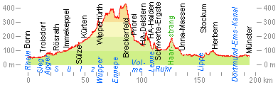 Auf dem Fahrrad direkt von Bonn nach Münster: Grundsätzlich gbt es zwei Möglichkeiten, von Bonn nach Münster (Westf.) zu radeln: Die Fahrt durch die Kölner Tieflandsbucht ins westliche Münsterland ist zwar mit wenig Steigungen verbunden, aber mit viel städtischem Ballungsgebiet oder reichlich Umweg. Die hier dargestellte Route durchs Siegerland und den Ostrand des Ruhrgebietes ist überwiegend ländlich. Von Bonn bis an die obere Wupper gelangt man ohne große Steigungen, in dem man von der Siegmündung an stetig talaufwärts fährt, entlang der Sieg, deren Nebenfluss Agger und deren Nebenfluss Sülz bis zur Ahe, einem Quellbach der Kürtener Sülz. Die Wasserscheide zwischen Sülz und Wupper wird auf 314 m &uu,l;.NHN gekreuzt, nur 44 m höher als die Wupperbrücke in Wipperfürth. Zwischen Wupper und Volme kommt man noch am idylllischen Oberlauf der Ennepe entlang. Anschließend kommt man auf dem Höhenrücken zwischen Ennepe und Volme erst über die höchste Stelle der Route, die Hügelkuppe des Wengeberges (438 m &uu,l;.NHN) und dann durch Breckerfeld . Heute eher dörflich, war es im Mittelalter eine Schmiedestadt von internationaler Bedeutung und deswegen Hansstadt. Von Breckerfeld rollt man auf einer fast immer ruhigen Landesstraße durch ein Seitental hinab zur Volme. Um mit dem Rad von der Volme an die untere Lenne zu gelangen, gibt es verschiedene mögliche Kompromisse zwischen viel Berg mit wenig Stadt und wenig Berg mit viel Stadt, nämlich Hagen (Westf.). Von der Ruhr an die Lippe überquert die Route den Haarstrane von Geisecke nach Unna-Massen, mit weniger Höhenmetern als über das Ardeygebirge bei Dortmund im Westen oder Überquerungen in Richtung Hamm weiter östlich. Die Lippe (und kurz vorher der Hamm-Datteln-Kanal) werden zwischen Stockum und dem gasbetriebenen Kraftwerk Gersteinwerk Stockum überquert. Danach ist man im Münsterland. |