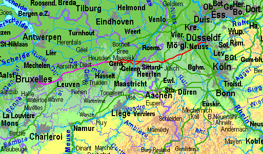 En vélo directement de Bruxelles à Düsseldorf ou de Düsseldorf à Bruxelles: Ce parcours entre Bruxelles et Köln (également de Bruxelles à Cologne et de Cologne à Bruxelles) évite le plupart des villes entre Louvain et Neuss. Du centre de Bruxelles au limite des la Region Capitale de Bruxelles le parcours est pas trop pollu par voitures et pas trop dificile à suivir, mais il n'est pas plain. De Tervueren à Louvain l' itinéraire suit la vallée de la Voer. Le vieux bourg et entrèe à vélo mieux sur la Naamsestraat que sur l'itnéraire officiel. Entre Louvain et Diest le parcours utilise routes moyennes et routes vicinaux. Entre Louvain et le Canal Albert le plupart du parcours est tranquile. De Heusden et Bilsen en deux sections il-y-a une alternative plus directe et une plus tranquile. Le reseau cyclable officiel et seulement utilisée partiellement, parce que sa maxime est loisir en vélo plus que mobilité écologique en vélo. Pour traverser la Meuse il-y-a deux bacs. Un travaille toute année de 7°° à la nuit. L'autre seulement travaille en été et ne commence avant 10°°. En Allemagne, de Selfkant a Köln (Cologne), la section plus occidentale est bien tranquile, et aussi la section entre Kückhoven (prà d' Erkelenz) et Neuss-Grefrath. . |