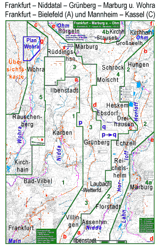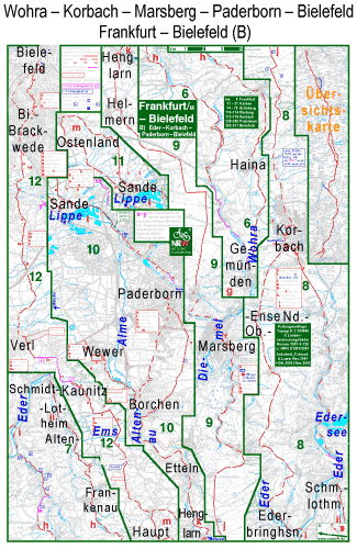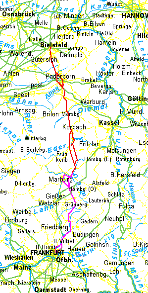 Auf dem Fahrrad direkt von Frankfurt am Main nach Bielefeld: Aus dem Norden von Frankfurt direkt an der Nidda durch Bad Vilbel, aus dem Osten von Frankfurt durch Bergen-Enkheim,Niederdorfelden (zu Schöneck) und Gronau (zu Bad Vilbel) nach Karben. Von Karben durch die breite Niederung von Nidda (Gem. Niddatal mit Ilbenstadt u. Assenheim) und Horloff (Gem. Reichelsheim) nach Hungen. Von HUngen durch kleinere Täler nach Grünberg. Die Altstadt von Grünberg ist besonders hübsch, lässt sich aber nicht ohne Probleme durchradeln. VonGrünberg östlich an Marburg und den Lahnbergen, westlich an Amöneburg und Kirchhain vorbei gerdewegs zum Zusammenfluss von Wohra und Ohm. Ab Ebsdorf (Ebsdorfer Grund) gibt es eine gute Zweigroute nach Marburg was eine gute Direktverbindung von Frankfurt nach Marburg ergibt. Die nördliche Zweigroute von Marburg an Lahn und Ohm entlang zur Wohramündung ist zwar überwiegend gut ausgebaut und ausgeschildert, verläuft aber großenteils sehr nahe an einer Schnellstraße. Außerdem bewirkt der Talverlauf einen ziemlichen Umweg. Im Wohratal überwiegend ein durchgängig asphaltiereter Radwanderweg. Aus dem Wohratal über die Eder nach Korbach gibt es 2 Varianten: Di e westliche enthält zwischen Wohra und Eder ein Stück Waldweg, die östliche nö rdlich der Eder einige km Bundesstraße. Die Strecke von Korbach nach Marsberg an der Diemel ist sehr direkt, aber nicht Rennrad-tauglich. Die (alte) Hauptstr. in Marsberg ist Einbahnstraße, Radfahren in Gegenrichtung frei. Das Freigabeschild am nördlichen EIngang ist aber zeimlich versteckt angebracht. Von Marsberg über das Sintfeld (Angesichts der vielen Windgeneratoren sollte man es inzwischen Windfeld nennen) nach Atteln und Borchen im Tal der Altenau und von dort nach Wewer. Ab Kirchenborchen gibt es 2 Zweigrouten nach Paderborn da vor allem die ruhigere einiges an Steigung hat sollte man nach Paderborn hinein nur fahren, wenn man dort etwas will. Nach Bielefeld geht es von Wewer durch Sande, Kaunitz und Verl. HIer sind die Ausläufer der Senne (Nicht so sandig wie die eigentliche) und, noch als kleiner Bach, die Ems. In Sande stößt eine Zweigroute aus Paderborn dazu. Für Paderborn : Bielefeld ist jedoch die Radnetz-NRW-Wegweisung direkter. Allerdings führt die hier empfohlene Route überwiegend durch ländliche Bereiche, die NRW-Route Paderborn überwiegend durch zersiedelte. Um statt nach Bielefeld nach Osnabrück weiter zu radeln, bietet sich die Route Osnabrück Paderborn an. Deren Verlauf ist von Paderborn bzw. seiner westlichen Umfahrung bis Verl mit dem von FrankfurtBielefeld identisch. Dann führt sie zwischen Bielefeld und Gütersloh hindurch durch Isselhorst. |