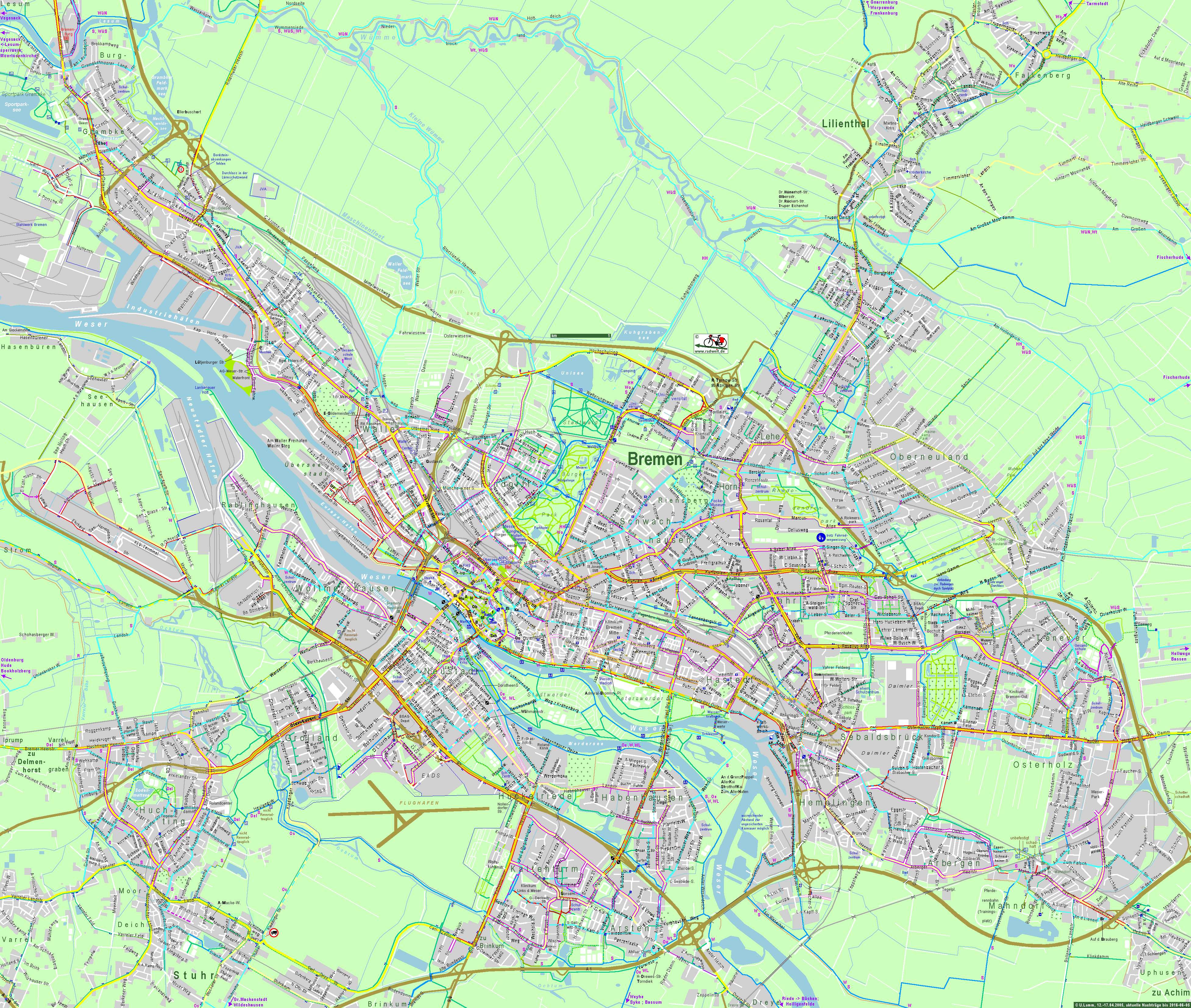 Inhalt und Beschränkung dieses Radverkehrsstadtplans: Dieser Stadtplan enthält nicht die Namen aller Nebenstraßen, keine Fahrradläden und nur wenige touristische Hinweise. Als Radverkehrsstadtplan konzentriert er sich auf Routenempfehlungen und auf Status und Qualitä,t der Radwege Straßen, straßenbegleitende Radwege, straßenunabhängige Radwege Die Einteilung der Radwege im vorliegenden Fahrradstadtplan von Bremen orientiert sich weitgehend an den ADFC-Empfehlungen für Fahrradstadtpläne. Obwohl die Zahl der Streckensignaturen an die Grenzen des Möglichen stößt, bleiben einige Wünsche offen: Was sind gute Radwege, was schlechte? Nur wenige Radwege in Bremen sind breit, gerade und so eben wie die Fahrbahn daneben. Nur wenige Radwege in Bremen erzwingen eine Fahrgeschwindigkeit unter 15 km/h. Das große Mittelfeld nervt mal mehr, mal vergisst man, dass es auch besser geht. Wo sich die Qualität mit dem Zentimetermaß bestimmen lässt ist es noch einfach. Bei Verschwenkungen und Verschleiß ist dei Grenze schwerer festzulegen. Welcher Art sind die Mängel? Je nach Fahrstil, Verkehrssituation, Witterung usw. interessieren unterschiedliche Qualitäten von Radwegen über die Wahl der Route und, nachdem ein großer Teil der blauen Schilder verschwunden ist, über die Wahl zwischen Radweg und Fahrbahn. So mancher Radweg ist eben aber viel zu schmal, breit aber schadhaft usw. . Ist die Oberfläche wasserfest oder Witterungsanfällig? Oder der Radweg selber ist ausreichend, aber der Gehweg daneben fasst den zahlreichen Fußgängerverkehr nicht. Oder der Radweg wird regelmäßig beparkt. Mehr Logos könnten da Aufschluss geben, würden aber die Geografie des Netzes unkenntlich machen. Die Darstellung von Verkehsregelungen wird erschwert, wo die Beschilderung unsystematisch ist. Radwegebenutzungspflicht: Dieser Fahrradstadtplan unterscheidet benutzungspflichtige Radwege (Pflichtradwege) und nicht benutzungspflichtige (freie Radwege). Er unterscheidet zwischen kombinierte Geh-und-Radwege (benutzungspflichtig) und solchen Gehwege, die laut Zusatzzeichen auch Radfahrer benutzen dürfen, so sie unbedingt wollen. Zurzeit sind in Bremen eigendlich nur die besten und ein Teil der schlechtesten Radwege benutzungspflichtig. Bei dem großen Anteil freier (StVO: anderer) Radwege wären eigentlich auch Besonderheiten der Fahrbahnen darzustellen, z.B. einspurige Richtungsfahrbahnen, auf denen man sich schnell den Zorn der Autofahrer zu zieht, auch wenn das Radfahren auf der Fahrbahn erlaubt ist. Besonders ärgerlich ist in diesem Zusammenhang die noch in Bau befindliche Daniel-Jacobs-Allee in Borgfeld West, Wohnsammelstraße ohne Straßenbahn, 30 km/h aber keine Tempo-30-Zone, freie Radwege, einspurige Fahrbahnen, durchgehende Mittelinsel. Tempo-30-Zonen: Der größte Teil der Bremer Wohnstraßen sind Tempo-30-Zonen. Die StVO sieht hier Mischverkehr auf der Fahrbahn vor, da sich die Autofahrer den Bedürfnissen der Anwohner unterordnen sollen, während Radwege den Autoverkehr privilegieren würden. In Bremer Tempo-30-Zonen gibt es einen großen Restbestand an Radwegen. Sie sind in diesem Fahrradstadtplan nur dargestellt, wo StVO-widrig eine Benutzungspflicht angeordnet ist. Die Tempo-30-Zonen selber sind ihrer Ausdehnung halber auch nicht dargestellt Das Normale soll man nicht hervorheben. |