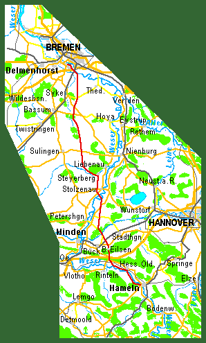 Auf dem Fahrrad direkt von Bremen nach Hameln oder von Hameln nach Bremen: Das Mittelgebirgstal der Oberweser bildet zusammen mit den anschließenden Tälern von Fulda und jenseits des Landrückens Sinn eine hervorragende Fahrradverbindung zwischen Nord- und Süddeutschland. Zwischen Hessisch Oldendorf und Vlotho verläuft das Tal jedoch nicht in Nordsüdrichtung, sondern in Westostrichtng. Und zwischen der Porta Westfalica fließt die Weser durch die Norddeutsche Tiefebene. Hier gibt es so viele Nebenstraßen und gut befestigte Wirtschaftswege, dass es keinen Grund gibt, hier dem Weserradweg zu folgen, von dem man zudem die Weser in der Ebene auf lange Strecken gar nicht sieht. Darum folgt die hier vorgestellte Route in der Ebene annähernd der Luftlinie von Bremen nach Bad Eilsen. Bei Bad Eilsen gibt eine Lücke zwischen den Höhen des Weserberglandes. So erreicht man hier den Norsüdwärts verlaufenden Teil des Wesertals etwa 25 km flussaufwärts der Porta Westfalica. Die nächste Stadt ist dann Hessisch Oldendorf. zwischen diesem und Hameln verläuft der Weserradweg neben der stark belasteten Bundesstraße auf der östlichen Talseite, die empfohlene Route dagegen an der merklich ruhigeren Landstraße auf der westlichen Talseite. Anschließende Routen: Nach Norden schließt sich in Bremen die Route Bremen Bremerhaven an, eine Umfahrung Bremens wurde hier noch nicht erarbeitet. In Affinghausen kann man westlich nach Oldenburg abbiegen, siehe Route Die Weiterfahrt südwärts durchs Wesertal ist als Route Hameln Wesertal Kassel dargestellt, mit einigen Verbesserungen gegenüber dem Weserradweg. daran schließt sich vor Allem die Route Kassel Fulda Würzburg an und daran die Route Würzburg Füssen, sowie die Routen Würzburg Ulm und Ulm Friedrichshafen (Bodensee). Von Hann. Münden kann man aber auch die Werra aufwärts fahren, siehe Route und dann Route Die Fahrradstrecke durchs Wesertal an die Werra ist etwa 20 km länger als die durchs Leinetal, dafür kommt man im Wesertal nicht durch Großstädte. Im Leinetal dagegen radelt man teilsweise in Hörweite einer Schnellstraße und einer Autobahn. Von Bremen auf dem Fahrrad nach Bad Sooden-Allendorf sind es über Bad Eilsen, Hameln und Hann. Münden 304,5 km, über Hannover und Göttingen nur 285 km. |