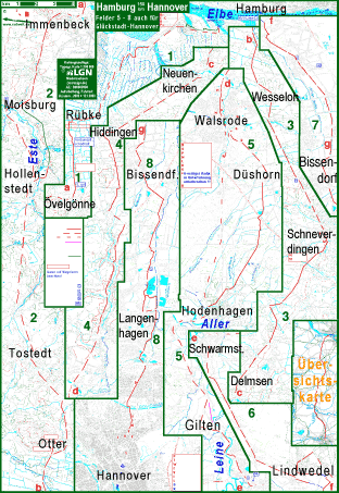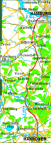 Mit dem Fahrrad von Hamburg direkt nach Hannover: Von den Landungsbrücken oder Hamburg-Altona nach Hamburg-Finkenwerder wird die Elbe mit den Fährschiffen der Linie 62 überquert. Von Finkenwerder führt die Route durch das Alte Land nach Ovelgönne, dann von Immenbeck nach Moisburg. Weiter geht die Route durch Hollenstedt, Tostedt und Schneverdingen nach Walsrode. Von Walsrode nach Hodenhagen hat die Route zwei Varianten. Die östliche macht einen kleinen Umweg, bei der westlichen fährt man mit dem Rad neben ziemlich viel Autoverkehr. Von Schwarmstedt nach Bissendorf ist die Route ziemlich ruhig. Bei der direktesten Variante muss man allerdings mit dem Fahrrad etwa 1 km durch Sand. Umfahrungen des schwierigen Routenabschnitts wurden aber mit abgefahren und dargestellt. Von Bissendorf am Ostrand der Stadt Langenhagen entlang nach Hannover nimmt man den Radwanderweg durchs Wietze-Tal. In Hannover kann man einige Kilometer gut ausgebaute Fahrradroute nutzen. Teilweise ist allerdings der Kleingärtner-Fahrweg auf der anderen Seite der Stadtbahngleise besser. |