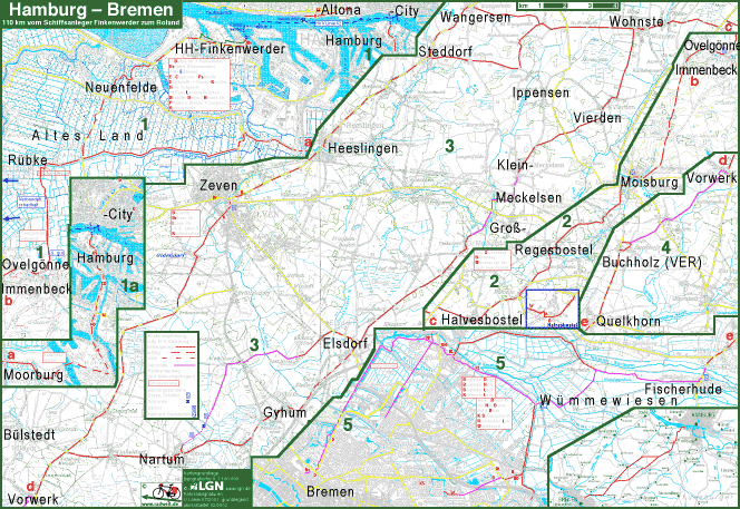 Mit dem Fahrrad von Hamburg direkt nach Bremen: Schon um Hamburg zu verlassen, bietet diese Route zwei verschiedene Varianten: Die angenehmere nutzt die Schiffsverbindung zwischen den St.Pauli-Landungsbrücken, Hamburg -Altona und Hamburg Finkenwerder (Linie 62 des Hamburger Verkehrsverbundes HVV). Vom Schiffsanleger in Hamburg-Finkenwerder muss man nur noch 2 km durch Stadt und dann am Airbus-Werksflugplatz vorbei. Dann ist man im Alten Land. Von Hamburg-Neuenfelde aus geht es erst auf Landstraßen nach Rübke, dann auf Wirtschaftswegen nach Ovelgönne am Südrand der Elbmarsch (Bitte nicht verwechseln mit dem Övelgönne zwischen Hamburg-Altona und Hamburg-Blankenese auf der Nordseite der Elbe!) Die andere Variante geht durch den alten Elbtunnel. Per Lift kommt man mit dem Fahrrad hinunter und südlich der Elbe wieder hinauf. Da man mit dem Fahrrad nicht über die Köhlbrandbrücke fahren darf, fährt man an ausgedehnten Lagerflächen vorbei zur Kattwykbrücke. Ab dem Dorf Hamburg-Moorburg macht die Fahrt mit dem Fahrrad mehr Spaß. Ab Hohenwisch bis vor Rübke ist die Strecke so gut wie autofrei, obwohl man sich immer noch in Hamburg bewegt. In Rübke treffen sich die beiden beschriebenen Varianten. In Immenbeck geht es auf die Geest, nicht so hoch wie in den Harburger Bergen. Die Strecke von Moisburg über regesbostel nach Halvesbostel ist außer der Ortsdurchfahrt Hovede ruhig. Ab Wohnste gibt es wieder mehrere Varianten. Die westliche geht über Zeven, die östliche über Klein- und Groß-Meckelsen und Elsdorf: Die Variante über Zeven ist ab Wangersen, spätestens aber Steddorf nicht ganz so ruhig, wie man sich das mit dem Fahrrad wünscht. Von Wangersen oder Steddorf über Heeslingen nach Zeven fährt man nämlich auf der L124. Der Radweg macht den Autoverkehr nicht angenehmer und ist v.a. in Heeslingen von recht mäßiger Qualität. Von Zeven durch Zeven-Oldendorf bis Brümmerhof ist die Strecke sehr ruhig, Auf deranschließenden L132 vermisst man wirklich keine Radwege, da die KFZ-Belastung nicht stark ist. Die östliche Variante hat zwischen Elsdorf und Nartum noch einmal zwei Möglichkeiten. Die östliche dieser Möglichkeiten verläuft bei Gyhum in der Lärmzone der Autobahn. Die westliche hat kurz vor Nartum etwa 3 km Schotterbelag und an einer Stelle recht enge Sperrpfähle. In feuchten Jahren wuchert der geschotterte Abschnitt teilweise zeimlich zu, obwohl das ein Teilstück des Radfernwegs HamburgBremen ist. 4 km nördlich von Vorwerk treffen sich die Varianten von Zeven und die Elsdorf wieder. Auf beiden gibt es Teilstücke des Radfernweges HmaburgBremen, der durch neue Schlenker gerade von 132 auf 150 km verlängert wurde, gerade in der neuen Version Reisende auf dem Fahrrad aber mit mehr Autoverkehr konfrontiert als die her empfohlenen direkten Routen. Von Vorwerk gelangt man durch Dipskorn, Buchholz (zu Wilstedt), Quelkhorn direkt nach Fischerhude (zu Ottersberg). Am Rand der Wümmewiesen ergeben sich dann wieder verschiedene Möglichkeiten, je nachdem, in welchen Stadtteil von bremen man will und wei gut man sich evt. in Bremen auskennt: In die Innenstadt von Bremen gelangt man am besten über Bremen-Borgfeld, von dort zum Kuhsiel und auf dem Kuhgrabenweg und durch den Bürgerpark.. In die östlichen Stadtteile fährt Bremen man besser auf dem Hodenberger Deich und durch Bremen-Vahr. Diese Fahrrad-Zufahrt nach Bremen wurde vor einigen Jahren durch die Asfaltierung eines Wegs quer durch die Wümmewiesen entscheidend verbessert. |