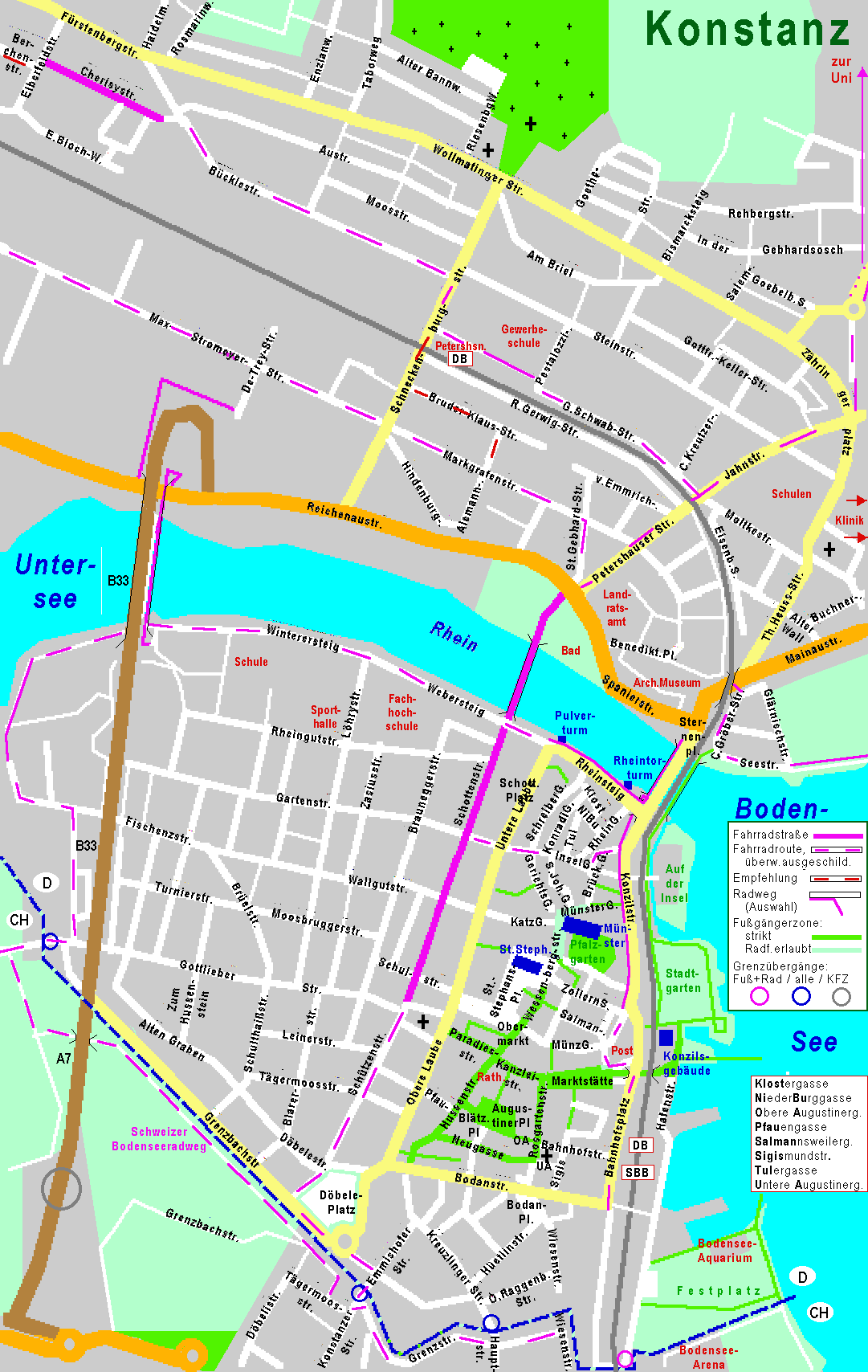 Stadtplan von Konstanz mit Fahrradrouten