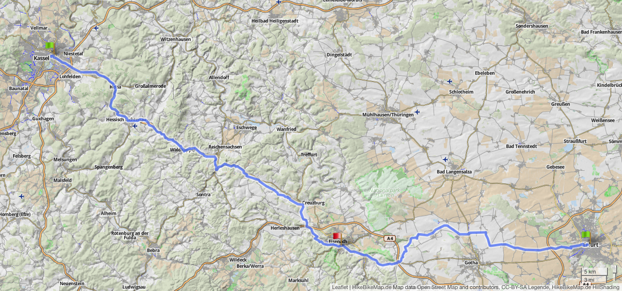 Per Fahrrad von Kassel über Eisenach nach Erfurt: Die kürzeste steigungsarme Fahrradverbindung von Kassel nach Eisenach besteht aus den Tälern von Losse, oberer Wehre, Netra, Ifta, Werra und Hörsel. Weitgehend kann man sich an Radwanderweg Herkules Wartburg halten. Er ist gut ausgebaut und ausgeschildert, verläuft allerdings von Kaufungen bis Hoheneiche auf langen Strecken in der Lärmzone der B 7, die Stück für Stück zur A 44 ausgebaut wird. An der Werra kann man den Umweg des Radwanderweges durch Creuzburg abschneiden, Um den Preis einer mit mittlerer Bereifung gut befahrbaren Schotterstrecke. Dagegen sollte man den sehr schlechten Waldweg zwischen H&–uml;rschel und dem H&–uml;rseltal südlich des Opelwerkes vermeiden. Die L 1021 ist zwischen der H&–uml;rselm&uunl;ndung und Stedtfeld meistens nicht stark befahren. Man fährt dann nach Stedtfeld hinein, überquert Landesstraße und Bahn und gelangt auf den dortgiut asphaltierten radwanderweg nach Eisenach. Von Eisenach nach Erfurt gelangt man kürzer als auf dem Radwandwerweg „Städtekette“ durch Friedrichswerth und Goldberg nördlich an Gotha vorbei. In Erfurt hat man die Wahl zwischen derstärker autobelasteten Binderslebener Landstr. vom Flughafen (für bergab trotzdem besser) und dem etwas schadhaften Asphaltweg "Langer Graben" parallel dazu. |