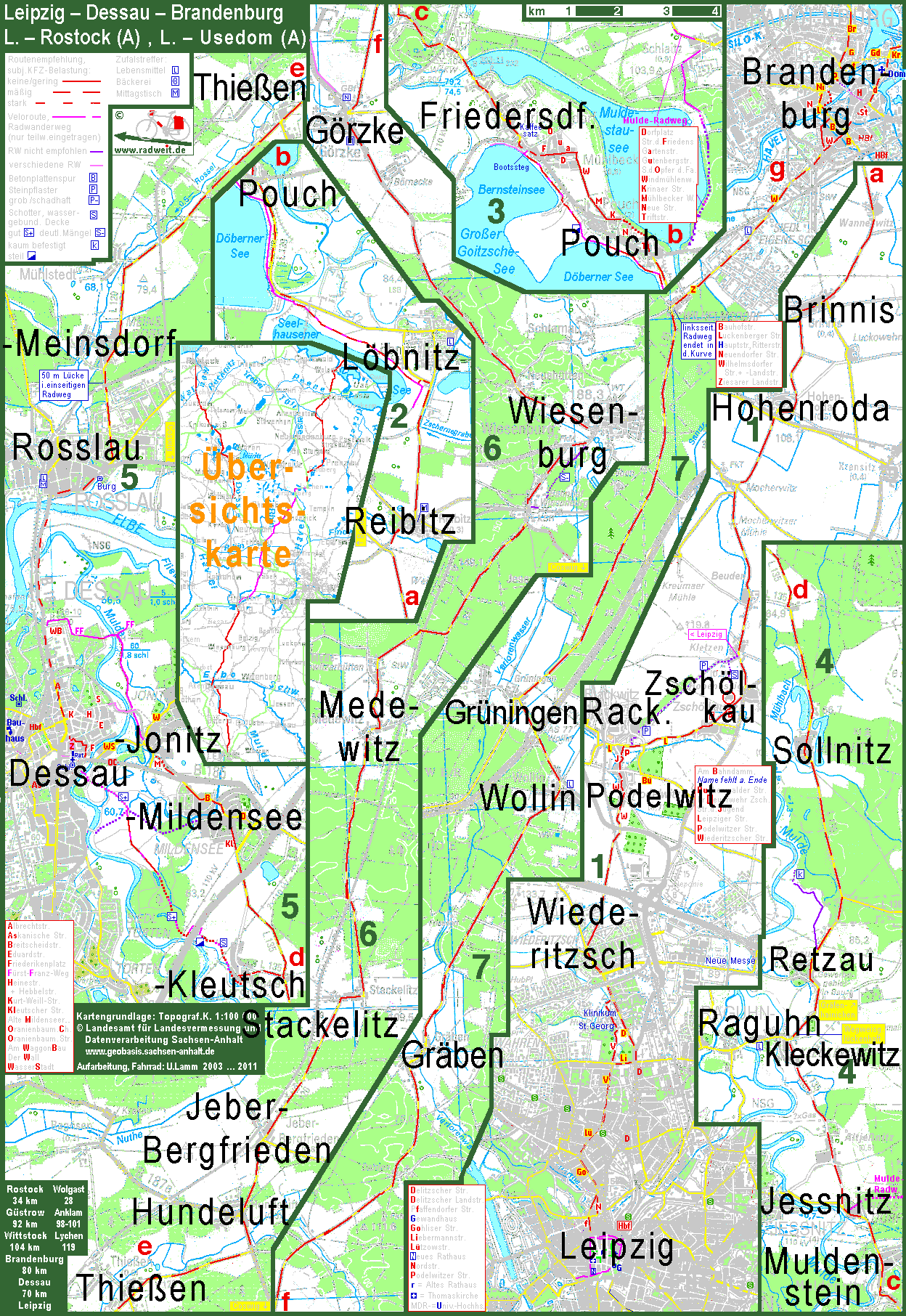 Von Leipzig auf dem Fahrrad direkt nach Rostock: Der erste Teil der Route geht von Leipzig über Pouch an der Mulde nach Dessau. Die Elbe wird von Dessau nach Rosslau überquert. Weiter geht es über Wiesenburg im Fläming nach Brandenburg an der Havel. |