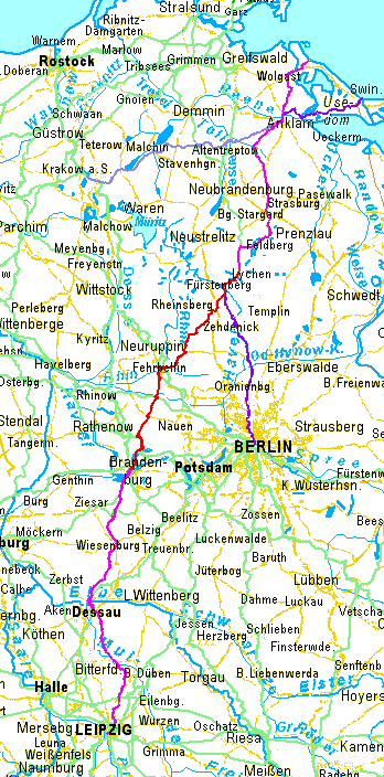 Hinter Lychen führt die Route durch die ziemlich hügelige Seenlandschaft von Feldberg und Fürstenwerder. Lychen und Fürstenwerder gehören zur Uckermark, Feldberg zu Mecklenburg-Strelitz. Von Fürstenwerder geht die Route geradewegs nach Norden durch Woldegk nach Friedland, gerade noch in Mecklenburg. Von Friedland nach Anklam kann man mit einem Bogen, der 5 km weiter ist als die Luftlinie, die stark KFZ-belastete B197 vermeiden. Die neu befestigte Querung eines Urstromtals zwischen Rebelow und Ramelow erleichtert dies sehr. Bei Anklam wird die Peene (Nebenfluss der Oder) überquert. nördlich davon gibt es zwei Müglichkeiten: Mit dieser Route ist die westliche dargestellt. Die Route geht nordwärts bis Wolgast. Bis Hohendorf ist der Autoverkehr ruhig bis mäßig. Auf den letzten km bis Wolgast ist leider die stark belastete B111 zu nehmen, da der südlichere Weg so sandig ist, dass er sichnicht durchgängiig befahren lässt. In Wolgast ist die Oberwallstr. zu umfahren, da für den Radverkehr gesperrt. Der Peenestrom (Mündungsarm der Oder) wird auf der eneuen Klappbrücke üquert. Von Wolgast zu den Seebädern im Nordosten von Usedom gibt es eine ruhige Nebenstrecke. Die Fahrt in den landschaftlich Interessanteren Osten von Usedom ist mit der Route Hamburg Usedom, Teil B, dargestellt. |