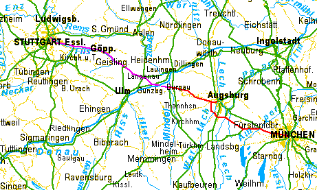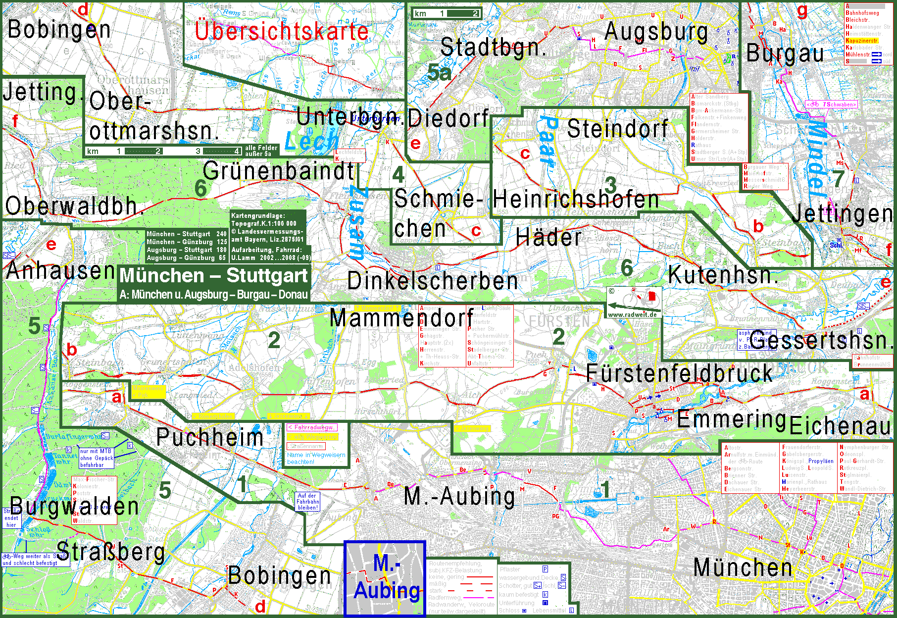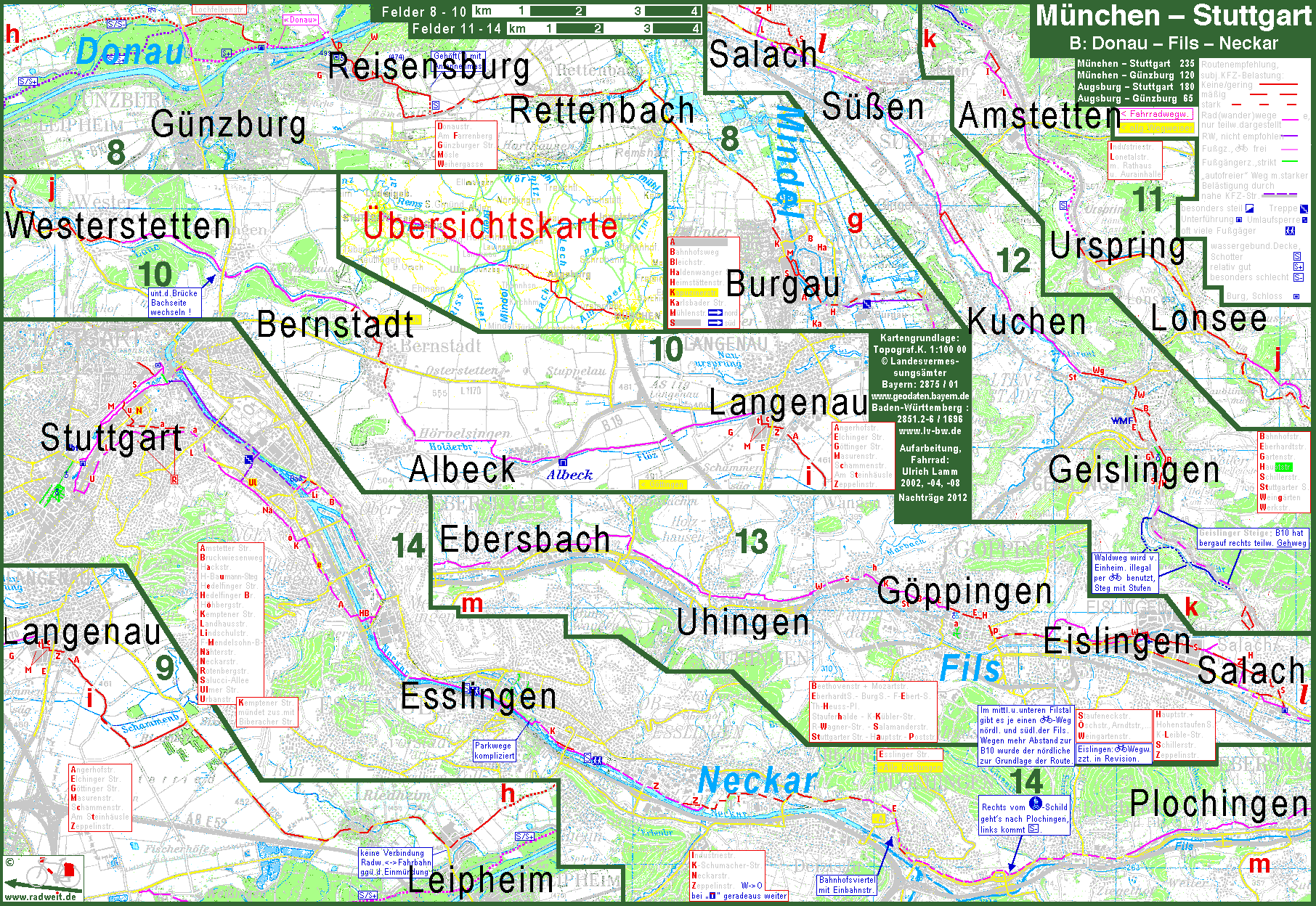 Auf dem Fahrrad von München direkt nach Stuttgart und von Augsburg direkt nach Stuttgart: Die Route verlässt München am Südrand des Schlossparks Nymphenburg und dann entlang der Bahnlinie nach Fürstenfeldbruck zum Lechfeld. Der Lech wird bei Bobingen überquert. Augsburg wird umfahren. Es gibt aber eine Zweigroute von Augsburg nach Westen. Durch Dinkelscherben nach Jettingen und Burgau an der Mindel. Die Donau wird in Reisensburg östlich von Günzburg überquert. Durch Langenau nach Albeck am Fuß der Schwäbischen Alb. Von dort gibt es gut ausgebaute Radwanderwege nach Bernstadt und von dort nach Westerstetten Von dort bis zur Wasserscheide in Urspring Wahl wischen nicht zu stark befahrener Straße und sehr gestückelten Radwanderweg. Von Urspring bis Amstetten Bahnhof statt Bundesstraße teils Schotterweg, teils Nebenstraßen. Da es von dort bis Geislingen, also auf der eigentlichen Geislinger Steige keine guten Alternativen zur stark befahrenen Bundesstraße gibt, ist die Route insgesamt von München nach Stuttgart besser (Da rollt man die Steige schnell hinunter.) als von Stuttgart nach München. Ab Geislingen auf dem nördlichen der beiden Filstal-Radwanderwege durch die Städte an der Fils: Süßen, Kuchen, Salach, Eislingen, Göppingen, Uhingen, Ebersbach. Am Neckar liegt der Radwanderweg auf dem Neckarufer sehr nah bei der Autobahn auf dem anderen Neckarufer: Plochingen, Esslingen. Nach Stuttgart fährt man mit dem Fahrrad wesentlich angenehmer auf Nebenstraßen am linken Talrand von Wangen nach Ostheim, als auf dem Radweg zwischen Autobahn und Neckar. |