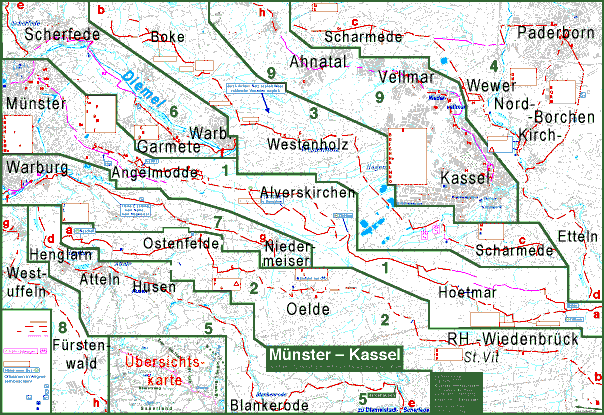 Auf dem Fahrrad direkt von Münster nach Paderborn oder Kassel, sowie von Paderborn nach Kassel Die komplizierte Titelzeile hat einen besonderen Grund: Einerseits ist die Lage Paderborns in der Südostecke der Münsterschen Tieflandsbucht verkehrsgünstig, sowohl in Nordsüdrichtung als auch in Westostrichtung kann man lange flach auf dem Fahrrad dahinrollen, bevor man über die Mittelgebirge strampelt. Andererseits ist das zur Weiterfahrt nach Süden oder Südosten besonders gut geeignete Altenautal von der Bischofsstadt durch einen hohen Hügelrücken getrennt. Auf Reisen in diese Richtungen kommt man also besser voran, wenn man südwestlich an der Stadt vorbei radelt. Der Routenteil vom Altenautal nach Kassel ist nicht nur für Touren aus Münster oder Paderborn nach Kassel geeignet, sondern auch aus dem Ruhrgebiet, aus aus Osnabrück oder aus Bielefeld nach Kassel. Aus dem Altenautal ereicht man das Südende des Eggegebirges und von dort das Tal der Diemel mit der Stadt Warburg. Um von dort nach Kassel nicht endlose Umwege zu fahren, empfiehlt sich eine nicht gar zu heftige Hügelroute. |
