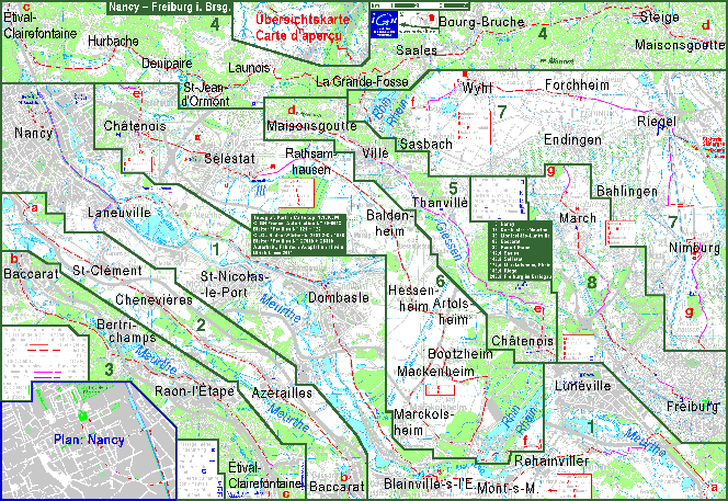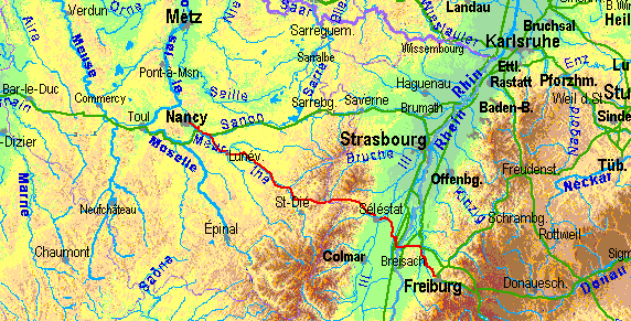 En vélo directement de la Nancy à Fribourg-en-Brisgau Le parcours est bien cyclable en aussi en l'autre direction, de Fribourg-en-Brisgau à Nancy. L'itinéraire suive la vallée de la Meurthe de Nancy jusqu'a Raon-l'Étape; depuis début de 2011 c'est possible tout en routes petites ou moyennes. Lunéville n'est pas touché, il-y-a un passage courte midi de la ville. Oriental de Raon, l'itinéraire traverse les Vosges par cols très modérés, le Col du Las (702 m sur la mère) et le Col de la Salcée, 588 m sur la mère et seulement 78 m sur Bourg-Bruche, le point plus bas entre les cols. Le Col de Steige est seulement un col demi avec une côte (Le mot allemand de "die steige" dit "la montée") à l'est, descendente à la vallée de Villé. De Séléstat au barrage de Marckolsheim routes tranquiles ont préferé au traject plus directe. En Allemagne, l'itinèraire va par Riegel pour éviter la montagne du Kaiserstuhl. Itinéraires correspondentes: Le traject Paris Strasbourg fait la communicatin de Paris à Laneuveville-devant-Nancy par la vallée du Petit Morin, Bar-le-Duc et Toul. En Riegel-am-Kaiserstuhl, le traject Strasbourg Zürich fait la communication a Zurich sur la Forêt-Noire (Glottertal, Titisee, Schluchsee) et traverse le Rhin supérieur à Zurzach en Argovie. Le traject Freiburg Ulm fait la communication au Danube supèrieur. Parce que les deux itinéraires se croisent sur l'hauteur de la Forêt-Noire, on peut aller à la Danube aussi par la montée min forte du Glottertal, et à Zurich aussi avec une visite de Fribourg-en-Breisgau. |