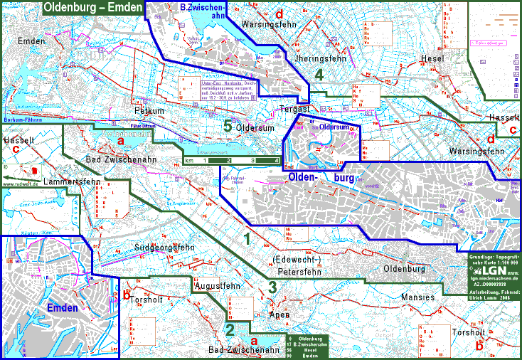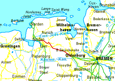 Per Fahrrad direkt von Oldenburg nach Emden: Die Route läuft uaf ruhigen Neb3enstraßen an den Westrand der Stadt Oldenburg, dann vieel km durch die "Waldlinie" von Edewecht-Petersfehn, zu mehr als der Hälfte ruhig, dann mäßiger Autoverkehr. Durch Bad Zwischenahn wahlweise auf der ehemaligen Hauptstraße oder auf Schleichwegen. Von Bad Zwichenahn-Deepenfurth nach Apen auf sehr ruhigen Landstraßen. Von Apen durch Südgeorgsfehn (dort ein Stück der ausgeschilderten Ammerlandroute), Lammertsfehn, Hasselt (Achtung: 2-mal rechtwinklig um die Ecke!), Hesel, Jheringsfehn (Aussprache Dscheringsfehn!), Warsingsfehn wird der Routenverlauf von Kanälen und Moorkolonien bestimmt, und von Netzlücken in Holtland. Deswegen fährt man mit dem Fahrrad besser nördlich vorbei durch Hesel. Westlich von Warsingsfehn stößt man auf dei Fahrradwegweisung Leer Oldersum. Von Oldersum nach Emden ergeben sich mehrere Varianten, je nach den Ansprü,chen an Wegequalität und Autoarmut. Wer in Emden zur Fähre nach Borkum will, kann anstatt durch die Stadt auch am Südrand der Binnenhäfen fahren. An den Schleusen zwischen Binnenhäfen und Emsmündung befinden sich Brücken. |