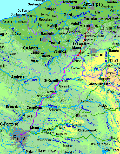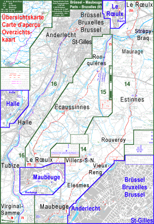 Mit dem Fahrrad direkt von Paris nach Brüssel, und natürlich ebenso von Brüssel nach Paris. Von Paris an die Oise und dann die Sambre und dann bis knapp über die belgische Grenze hat diese Routenempfehlung den gleichen Verlauf wie die Strecke von Paris nach Wesel. Von der Île de la Cité im Zentrum von Paris zum nordöstllichen Stadtrand benutzt die Routenempfehlung weitgehend amtliche Routen der Stadt Paris. Durch die Banlieue, den dicht bebauten Vorortgürtel von Paris, benutzt die Route den beinahe kreuzungsfreien Radweg am Canal de l'Ourcq, da die Richtung leidlich stimmt und auf anderen Routen Orientierung und Vorankommen mit dem Fahrrad wesentlich schwieriger wären. In der anschließenden ländlichen Region ist grundsätzlich gut für Radtouren geeignet. Hier wendet sich die Route nordwärts. Durch den Wald von Compiègne, wo der Ort zweier Waffenstillstände geradezu am Wege liegt, erreicht man die Oise, ohne die Flussschleifen und großen Städte an ihrem Unterlauf passieren zu müssen. Vom Mittellauf der Oise gibt es einen Talübergang zur Sambre, der auch vom Canal de la Sambre à l'Oise benutzt wird. Durch dieses Tal erreich man mühelos mit dem Fahrrad Maubeuge an der Sambre. Die fließt hier weniger als 30 Höhenmeter unter der Wasserscheide zwischen Maas und Schelde. Über diese niedrige Hochfläche erreicht die Route unter Vermeidung der meisten größeren Orte der Brüssel-Charleroi-Kanal. Auf dem Ostufer dieses Kanals verläuft ein Radwanderweg, der im wallonischen Teil Belgiens zum RAVeL-Netz geh–rt, im flämischen zu den Landelijke Fietsroutes. Auf diesem Weg gelangt man mit dem Fahrrad bequem und schnell bis zu den Hafenbecken im Br&üsseler Vorort Anderlecht. Hier wechselt der Radwanderweg auf das westliche Kanalufer, aber leichter ins eigentliche Brüssel gelangt man mit der mäßig befahrenen Straße auf dem Ostufer. An der Grenze zwischen Anderlecht und Brüssel stellen große verkehrsreiche Plätze ein gewisses Hindernis dar. In der Altstadt von Brüssel sind die meisten Einbahnstraßen und wichtige Telie der Fußgängerzonen zum Radfahren freigegeben. An touristisch besonders interessanten Stellen können aber Menschentrauben der Durchfahrt im Wege stehen. Die bekannte Grand-Place (Grote Markt) liegt kaum über dem Niveau des Kanals. östlich davon steigen die Straßen aber recht steil an. |