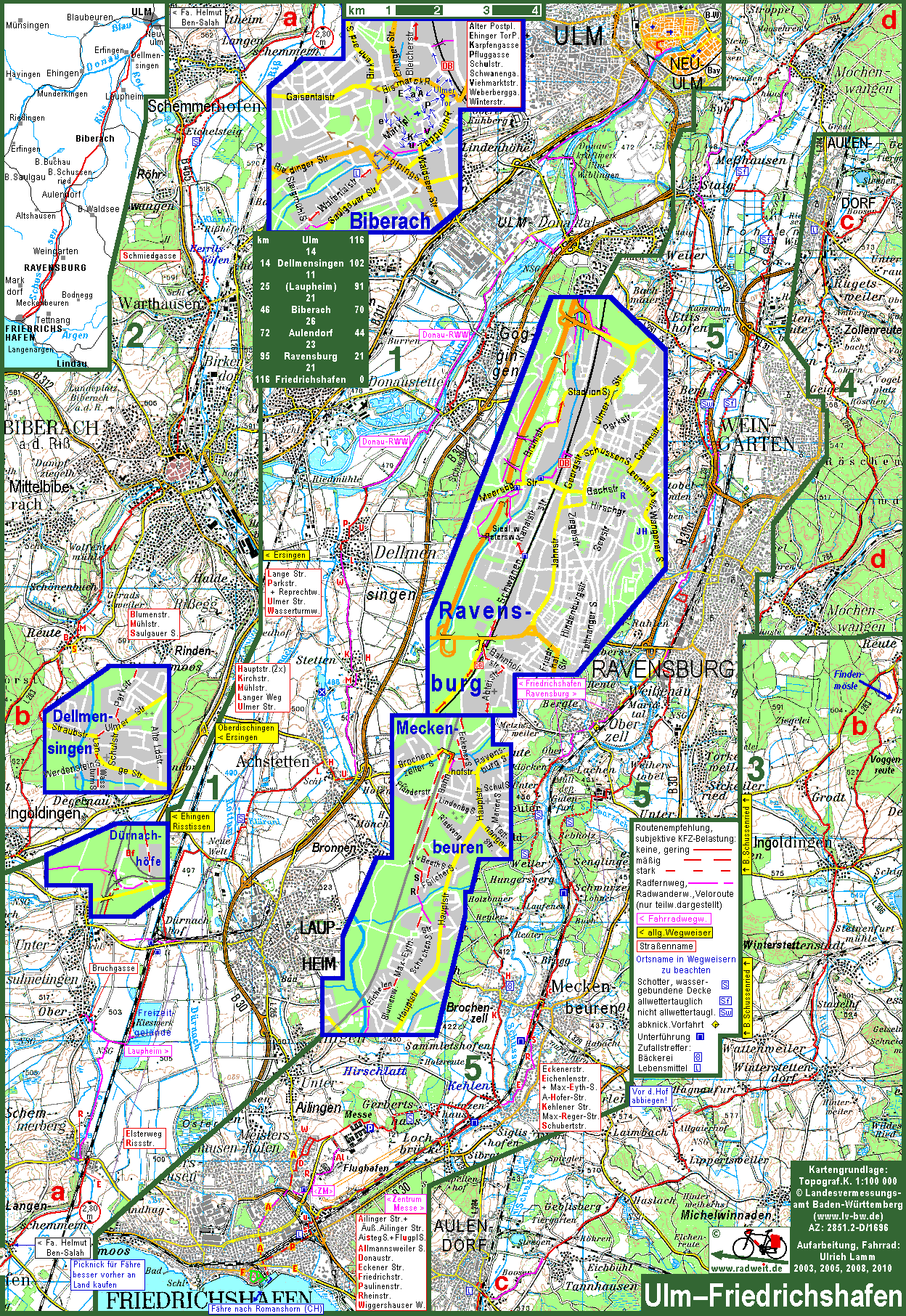 Auf dem Fahrrad von Ulm an der Donau direkt nach Friedrichshafen am Bodensee: Die Route folgt dem Tal der Riss bis Biberach und führt dann über sanfte Hügel nach Aulendorf. Dem Tal der Schussen folgt die Radfahrt erst ab Mochenwangen.Weingarten wird nicht durchfahren. In Ravensburg bleibt sie zwischen Bahnlinie und Schussen. Auf Nebenstraßen und Waldwegen geht die Tour weiter auf der rechten Talseite nach Friedrichshafen. | |