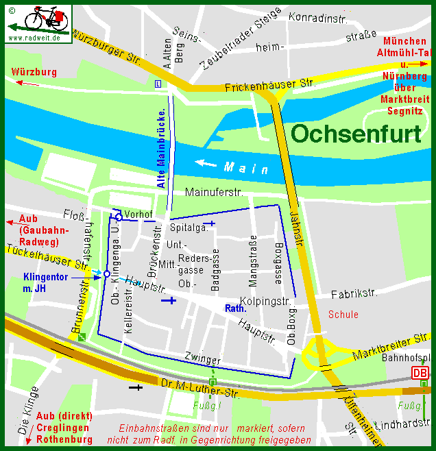 Über die flussaufwärts gelegene neue Mainbrücke darf offiziell nicht geradelt werden. Es wurde zwar extra eine Fähre neben der alten Brücke eingerichtet,
