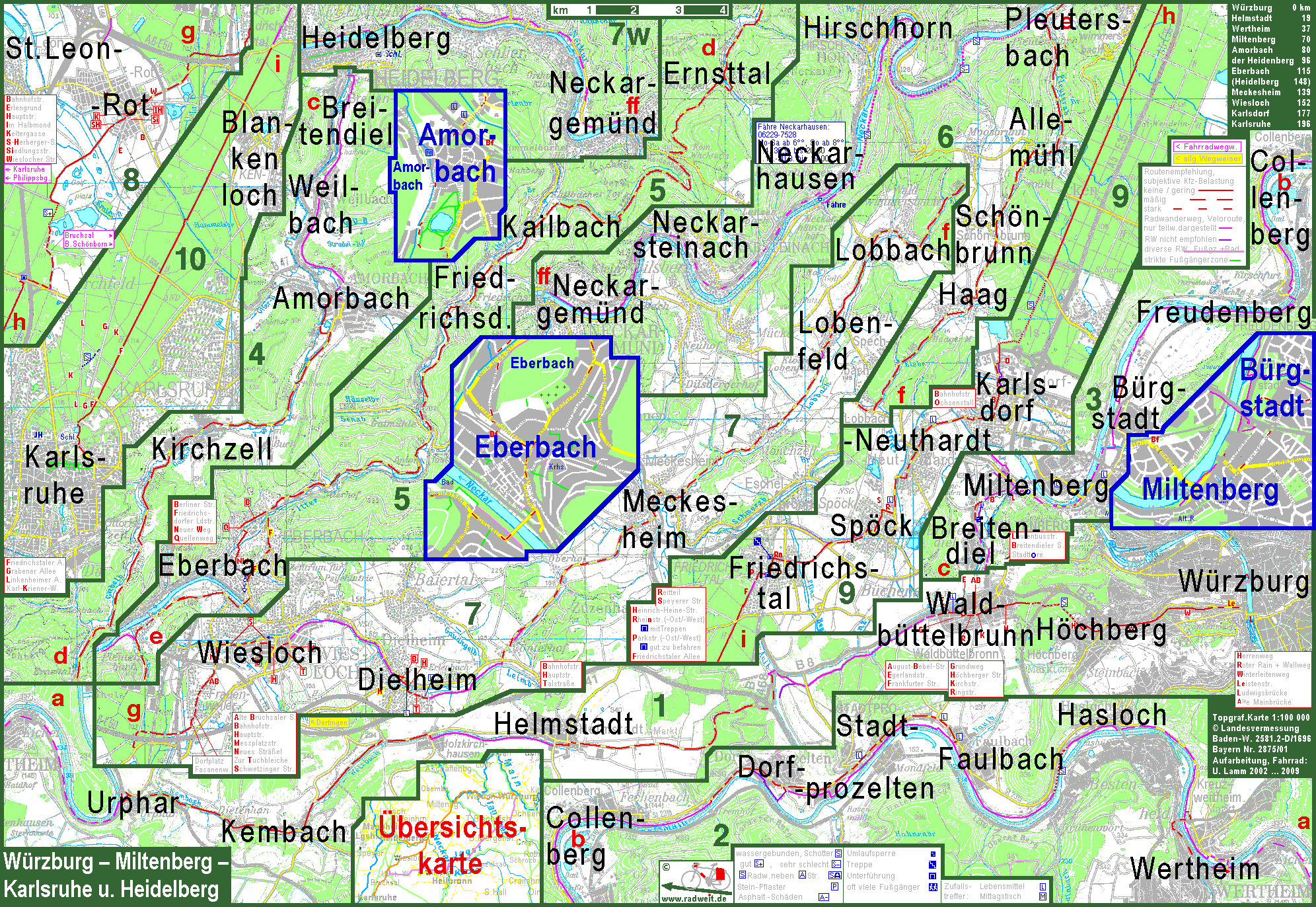 Auf dem Fahrrad direkt von Karlsruhe und von Heidelberg nach Würzburg: Die Routen von Karlsruhe und von Heidelberg treffen sich im Neckartal, da man bei Radtouren von Karlsruhe nach Würzburg besser durch den nördlichen Kraichgau östlich an Heidlberg vorbeifährt. Ab Karlsruhe: In Karlsruhe beginnt die Route mit der Friedrichsthaler Schneise vom Schloss durch den Hardtwald. Hinter Stutensee-Friedrichsthal, Spöck und Karlsdorf gelangt man in den Nordosten des Hardtwaldes (Lußhart). Von Karlsdorf nach St.Leon-Roth ist eine östlichere Schneise (auch mit Wegweisung) kürzer als die Baden-Württembergische Hauptroute. Am Ausgang des Waldes ist diese östliche Route allerdings 1/2 km lang kaum befestigt. Von St.Leon-Roth auf Nebenstraßen mit Fahrradwegweisung nach Wiesloch. In Wiesloch kommt man leider schlecht mit dem Fahrrad durch die Altstadt. Da es nördlich davon hügelig ist, fährt man besser südlich daran vorbei. Der Radwanderweg von Wiesloch in den Kraichgau macht ziemliche Umwege. Darum besser auf der Landstraße über die Höhe nach Meckesheim. Dann bei Gauangelloch über einen weiteren Höhenrücken nach Bammental. Dann das Lobbachtal aufwärts, vn dort nach Haag und dann von Allemühl abwärts nach Eberbach. Ab Heidelberg: Der Neckarradweg ist nicht immer eben. Er führt zwar durch eine sehr schöne Landschaft, ist aber zwischen Heidelberg und Eberbach lange Strecken mal Bundesstraße, mal holperiger Waldweg, vor allem bei Nässe nur langsam zu befahren, um nicht in den Neckar zu stürzen. Hügelig bis bergig, aber mit gutem Asphalt und nicht zu viel Autoverkehr gelangt man stattdessen über Lobbach und Haag nach Eberbach. Von Eberbach durchs Tal der Odenwaldbahn nach Kailbach, über die Passhöhe nach Ernsttal und von dort immer flussabwärts nach Amorbach und Miltenberg ist die optimale Fahrradstrecke vom Neckar über den Odenwald an den Main. Von Miltenberg mainauffwärts wurde leider in Burgstadt außer dem Radwanderweg jetzt auch die Umgehungsstraße ans Mainufer gelegt. Dahinter ist der Maintalradweg aber schön und ruhig und bis Hasloch (kurz vor Wertheim) durchgängig asphaltiert. Von Wertheim nach Waldbüttelbronn und Würzburg nimmt man statt des Radwanderweges, der oft nahe an Autobahn und Bundesstraße verläuft, besser die 5 km kürzere Strecke durch's südliche Paralleltal von Urphar nach Helmstadt Nur der (sehr sanfte) Übergang ins Waldbüttelbronner Tal hat eine Autobahnauffahrt. Von Waldbüttelbronn durch den Wald nach Höchberg. Von dort nach Würzburg ist der Winterleitenweg (ruhige Tempo30-Straße, optimal für's Fahrrad) deutlich angenehmer als die offizielle Route (Radweg nahe der Hauptstraße). |